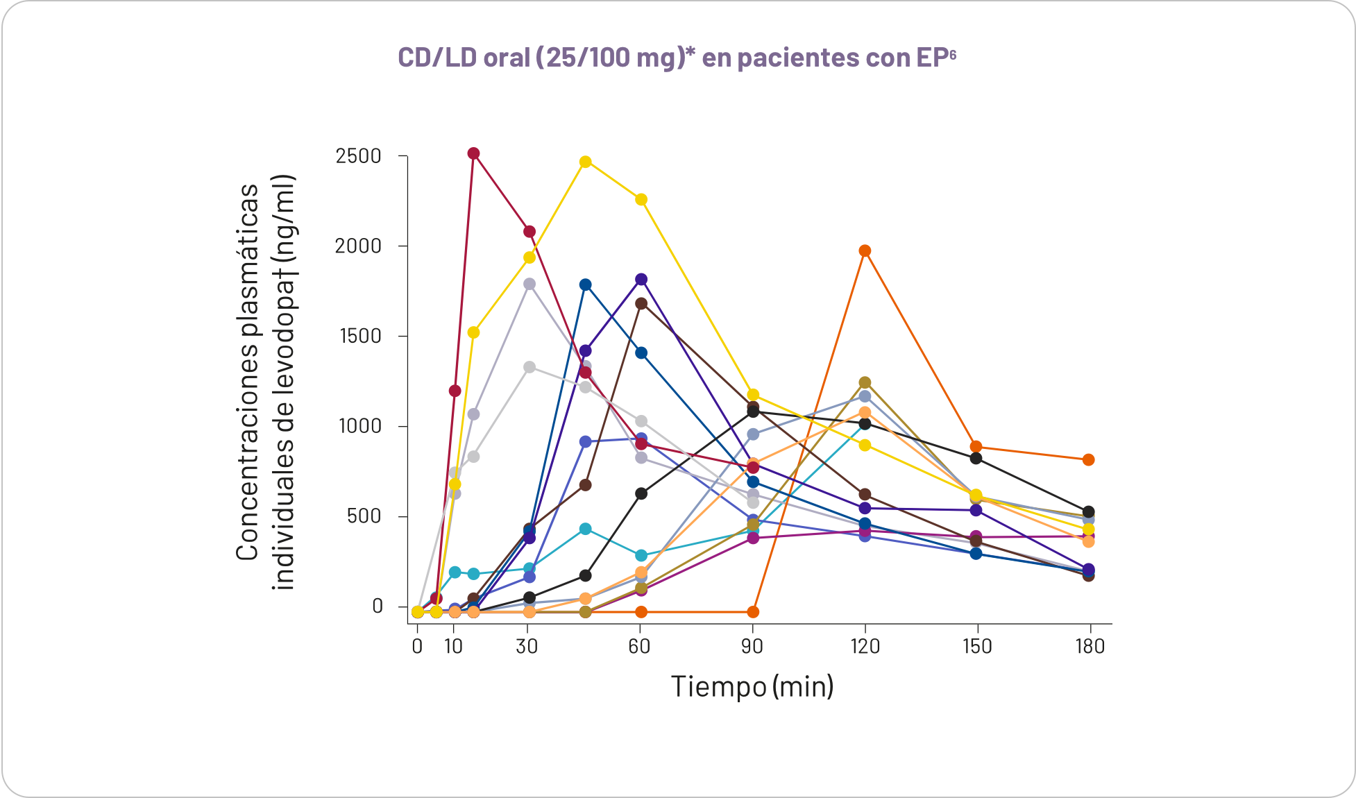 La variabilidad en las concentraciones plasmáticas con LC/CD oral da lugar a la aparición de períodos OFF en pacientes con enfermedad de Parkinson6